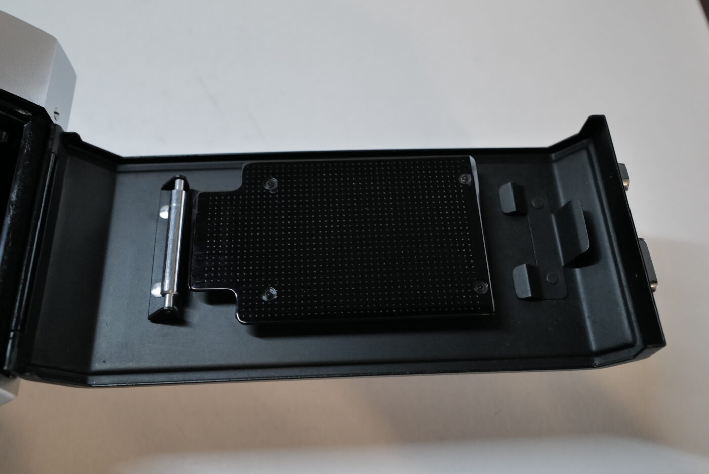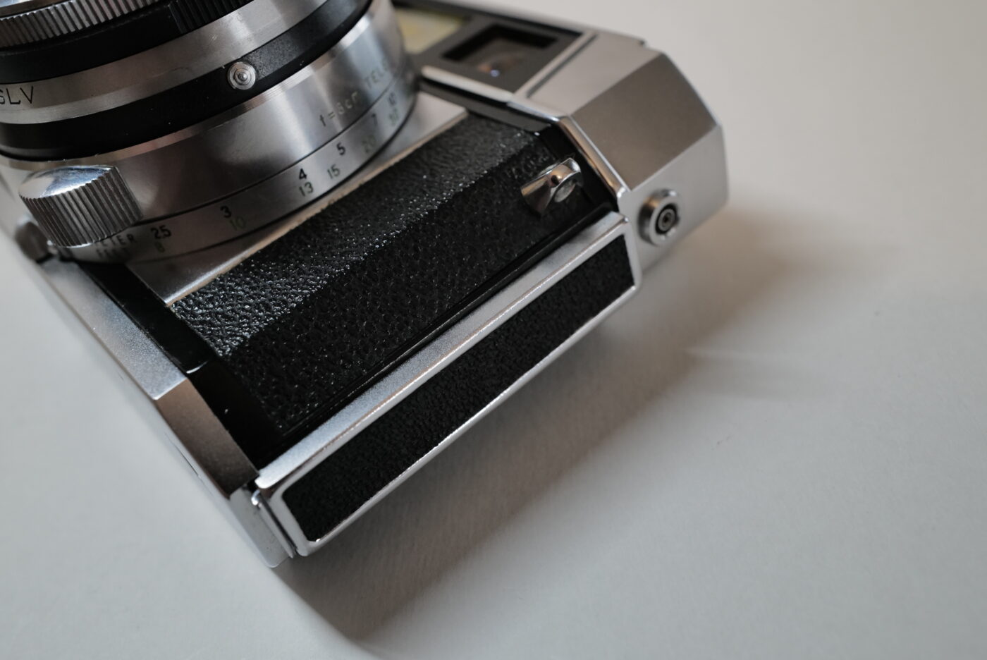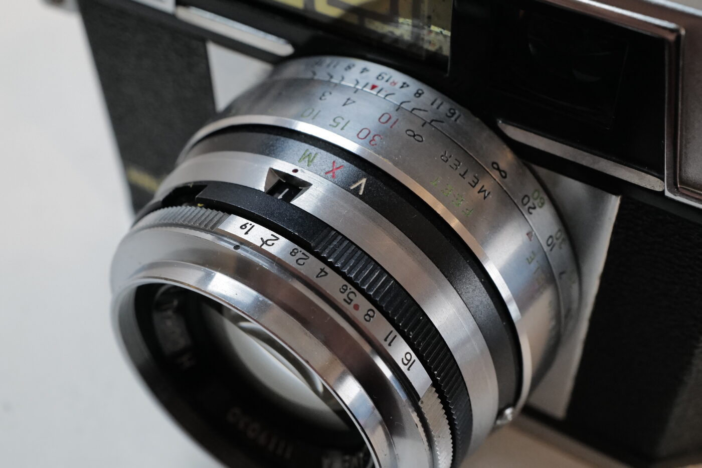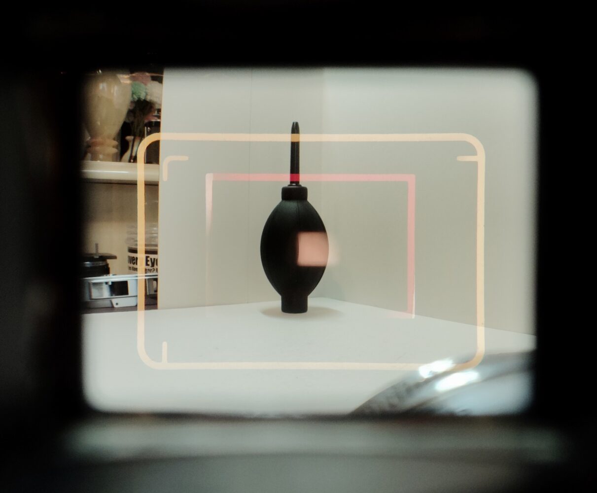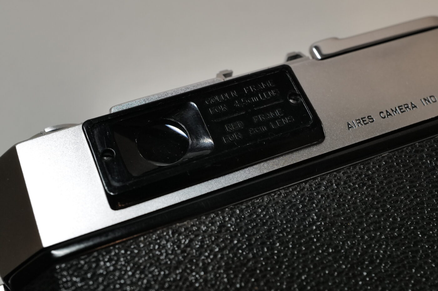 ブライトフレーム窓は金メッキされており、内側の赤い枠は80ミリ・コンバージョン・レンズ用の画角を示しています。